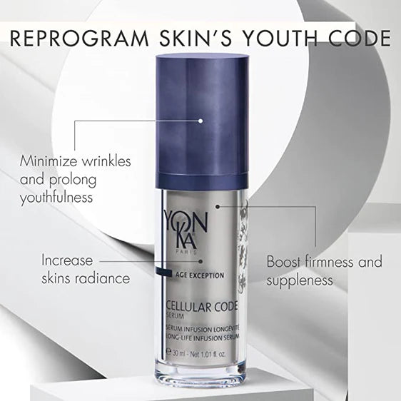 Our silky, elegant anti-aging serum is powered by Yon-ka’s proprietary cell-energy complex. This intuitive serum reprograms the skin’s youthfulness by enhancing cellular longevity, boosting cellular longevity proteins, and revitalizing cellular energy. By restoring the intercellular communication between skin cells, and reinvigorating oxygenation, skin functions are optimized – wrinkles appear smoother, skin feels firmer and the complexion supremely radiant.