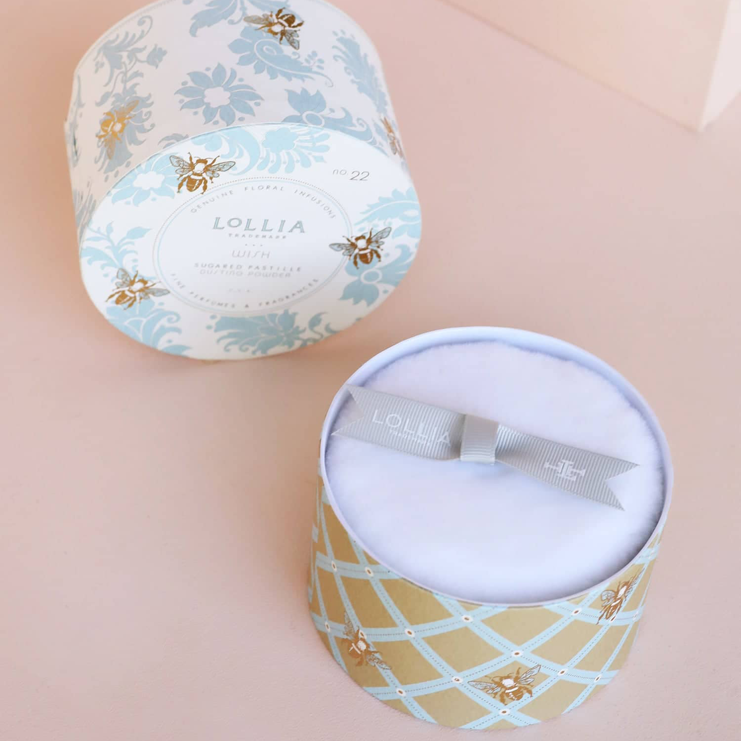 Wish: A true hallmark of modern romantic luxury, new Lollia Perfumed Dusting Powder softens & delicately scents skin with a finishing touch of beautifully elegant powder in Wish fragrance. Classically feminine and designed in exquisite detail to adorn your vanity. Talc and shimmer free.