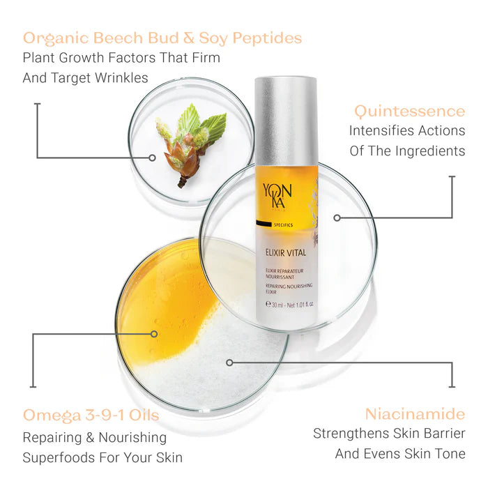 Our dual-phase reparative anti-aging serum is the ideal treatment for dry, dehydrated and distressed skin. Elixir Vital is powered by an exquisite blend of three cold-pressed botanical oils and 19 amino acids. This rich youth elixir is the best face serum for soothing and repairing skin irritated by professional treatments and procedures, or skin that simply appears tired and distressed. Corrective elixir formulated to smooth wrinkles and fine lines and restore a fresh, healthy and visibly younger appearance.