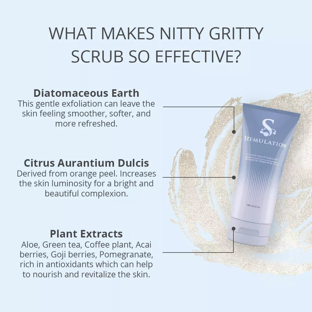Nitty Gritty Face and Body Polish is a refinishing and refining exfoliating scrub. It has an amazing exfoliant (Diatomaceous Earth), with natural refining properties to reduce pore size and increase the skin luminosity for a bright and beautiful complexion.