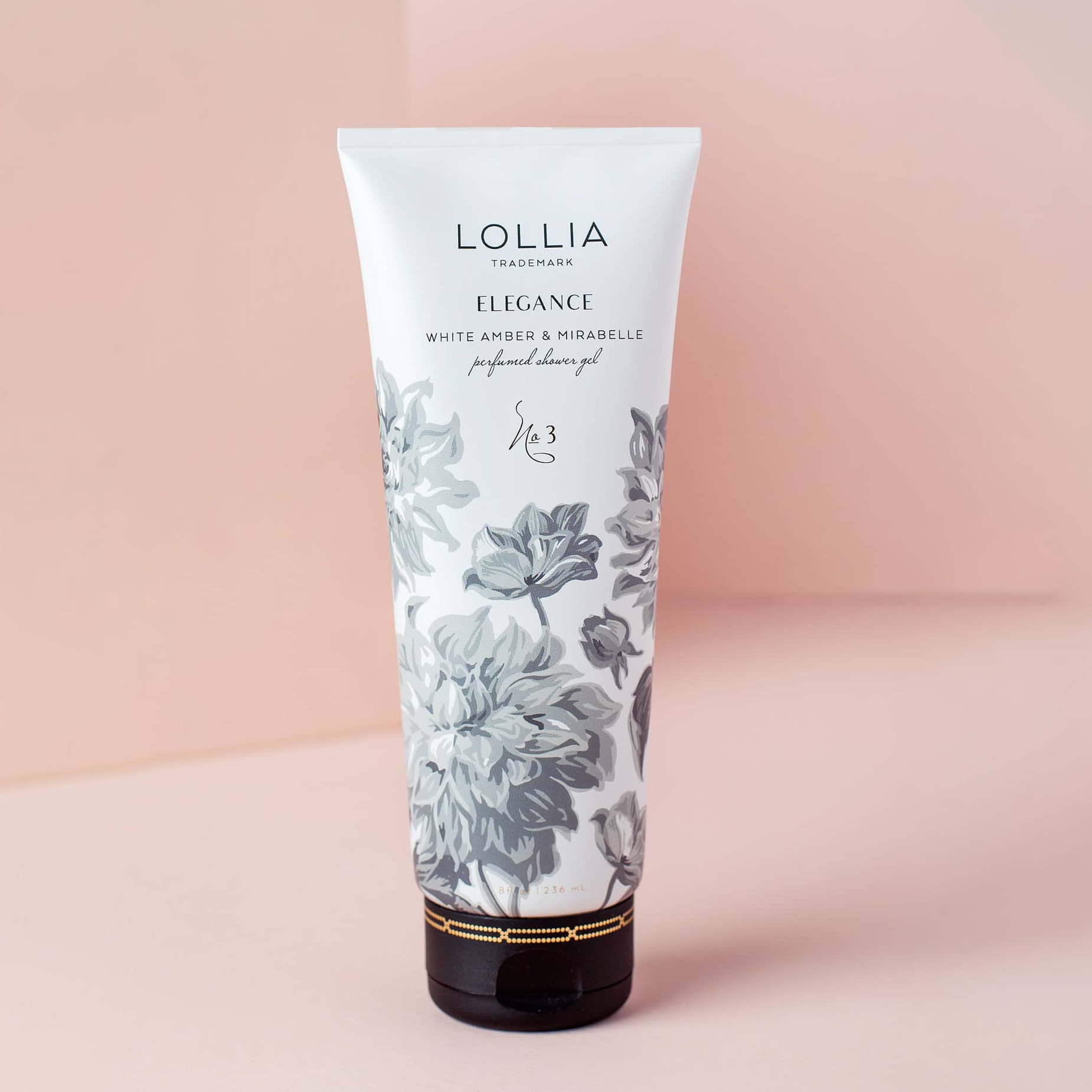Elegance: Shea Butter & Jojoba Oil hydrate skin, delivering essential nutrients to smooth & moisturize. Delicate notes of White Amber & Mirabelle mingle with Aloe, Honey, and Mango Extract leaves skin beautifully scented and refreshed.